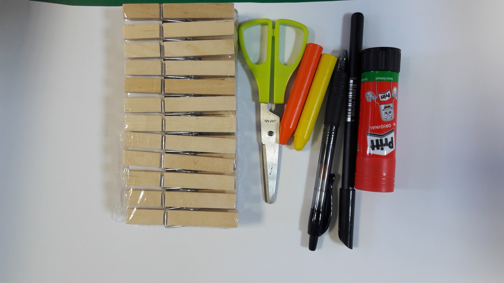 Materiales: Tijeras, pinzas, cartulina blanca, pegamento, pintura de dedos amarilla,rotulador negro.