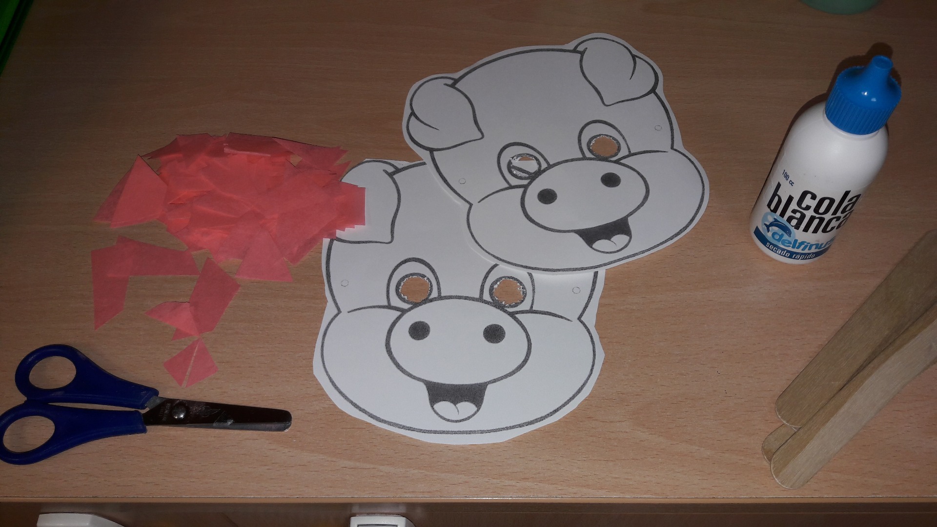 Materiales: Cartulina blanca(dibujar cara de cerdo), pintura rosa, tijeras, palos de madera, pegamento, papel crepé rosa.